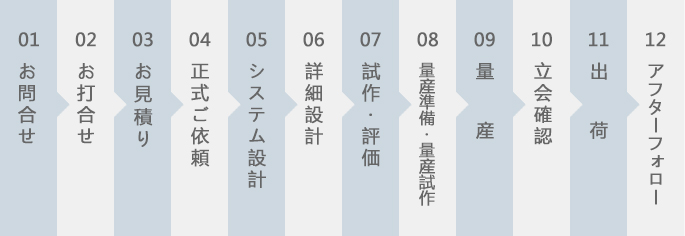 納品後の商品について、サービスパーツ対応、材料変更、認証取得、既存商品の上でバージョンアップ等の対応をさせていただきます。 どうぞ、お気軽にお問い合わせください。